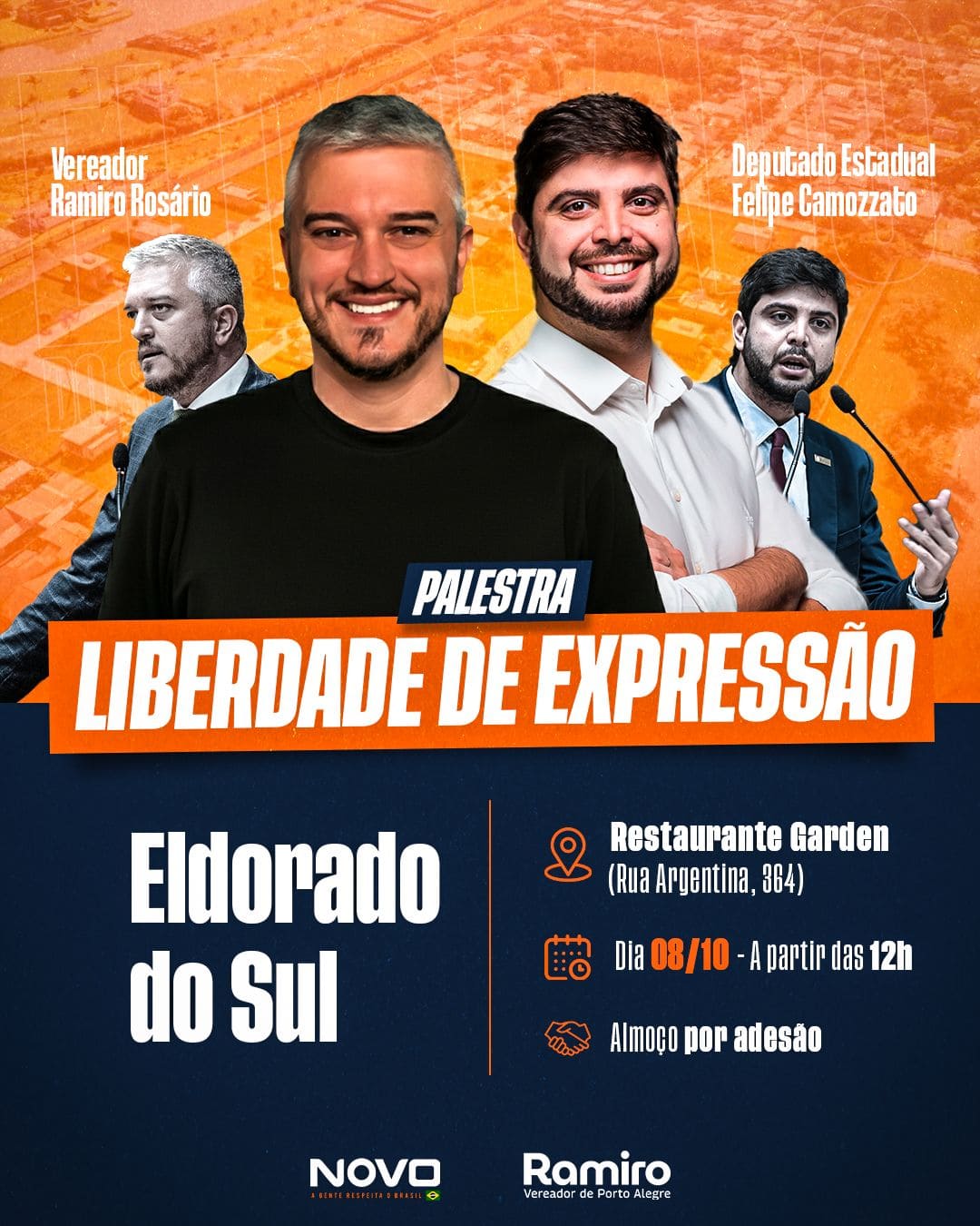 Para aprofundar essa discussão, o vereador de Porto Alegre Ramiro Rosário e o Deputado Estadual Felipe Camozzato estarão em Eldorado do Sul, conduzindo uma palestra para os filiados e simpatizantes do Partido NOVO sobre os desafios, os limites e a importância da liberdade de expressão para a construção de um país verdadeiramente livre.