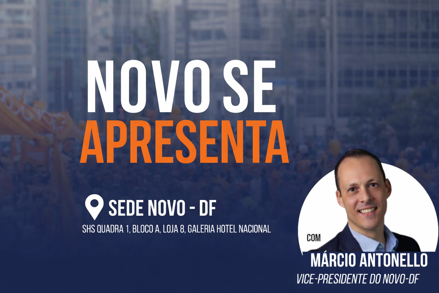O Partido NOVO DF convida você para o NOVO se Apresenta, um encontro destinado a apresentar a proposta, os valores e a forma diferente de fazer política que constroem o partido.