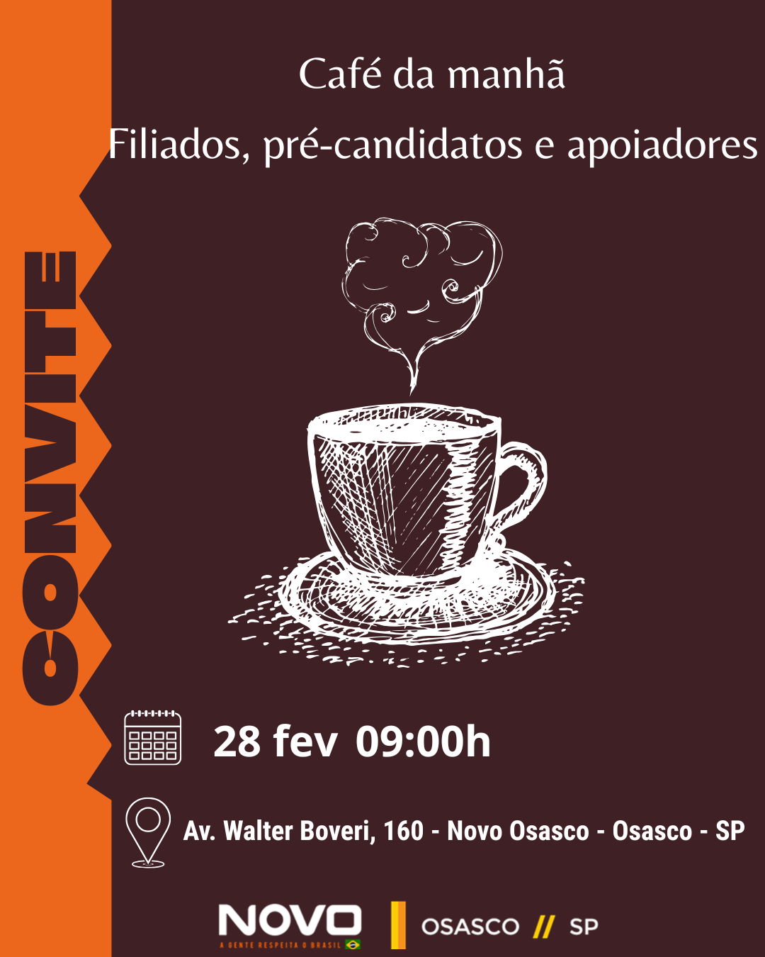 O DM Osasco convida os seus filiados, pré-candidatos e apoiadores para o café da manhã a ser realizado em 28/02 às 09:00hs na Av. Valter Boveri, 160 - Novo Osasco - Osasco - SP.