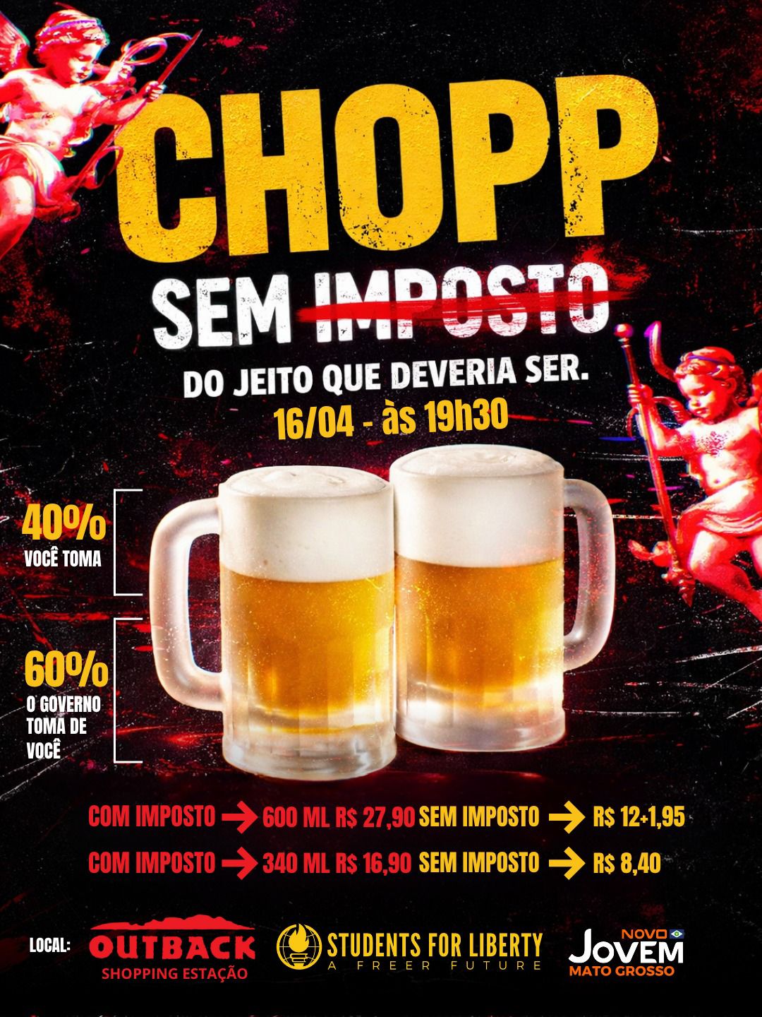 Evento "Chopp sem Imposto", promovido pelo Novo Jovem, no Outback do Shopping Estação em Cuiabá- MT, com chopp com preço reduzido de R$ 27,90 para R$ 13,95 (600 ml) e de R$ 16,90 para R$ 8,40 (300 ml).