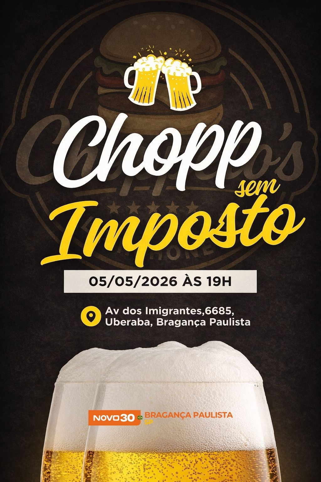 O Partido NOVO de Bragança Paulista convida você para uma noite descontraída, com muito chopp e um papo sério sobre o assunto que todo brasileiro conhece bem: os impostos que pesam no bolso de cada um de nós.