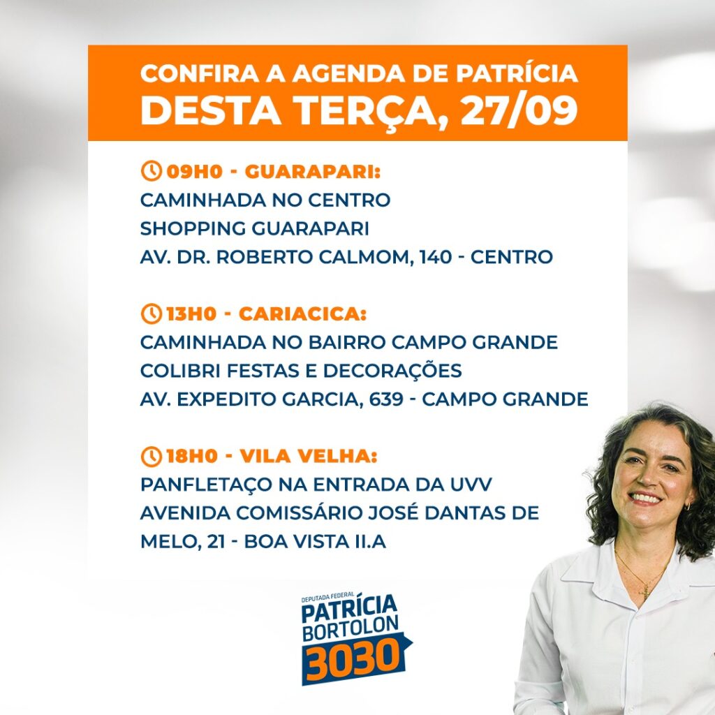 Terça-feira de campanha pessoal! Vamos encontrar a Patrícia Bortolon? Ela estará nas cidades de: Guarapari, Cariacica e Vila Velha. Segue a agenda 3️⃣0️⃣3️⃣0️⃣ 😉🧡. Confira!
